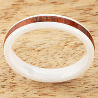4mm Natural Hawaiian Koa Wood Inlaid High Tech White Ceramic Barrel Wedding Ring
